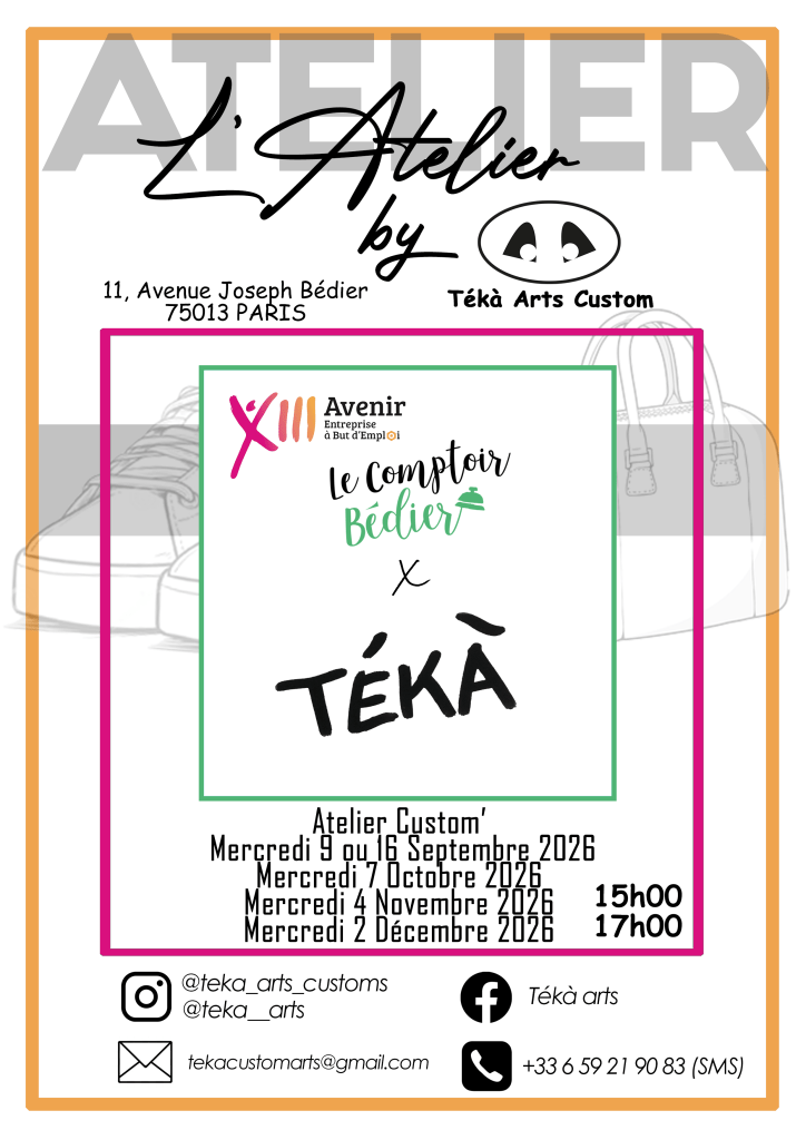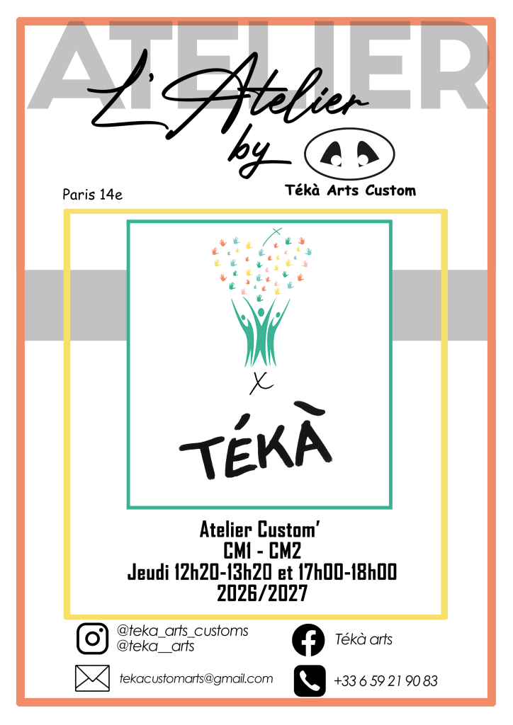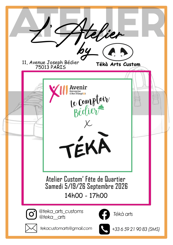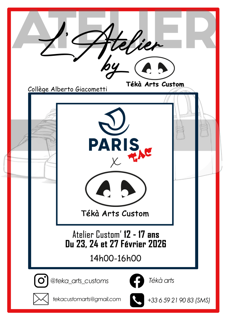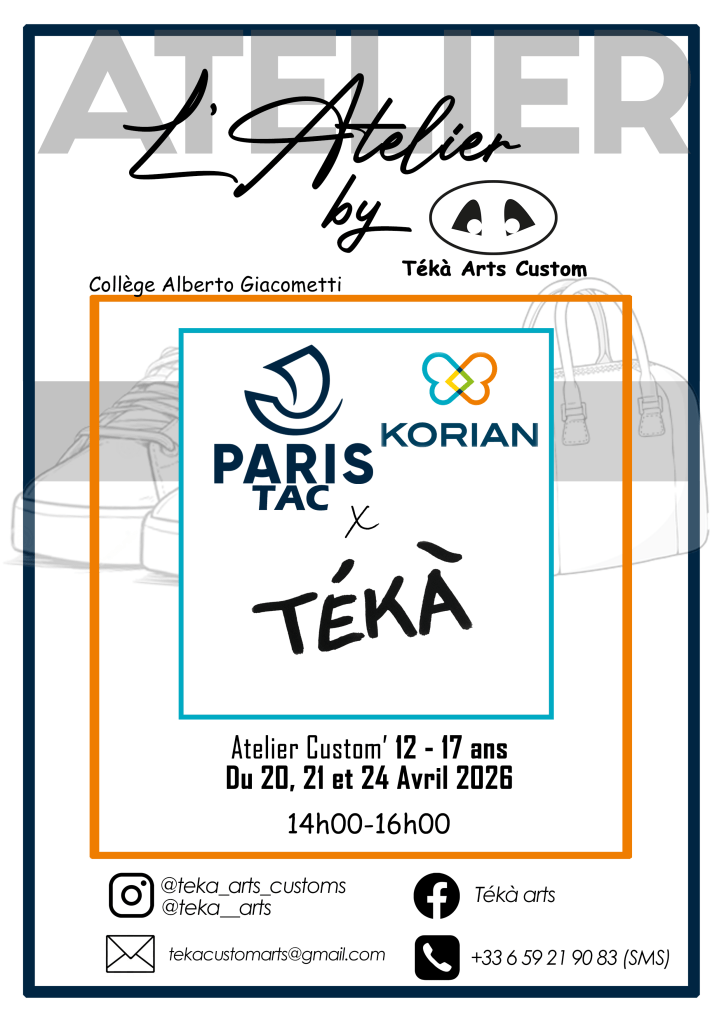 L’atelier Tékà Arts Custom intervient aujourd’hui auprès d’enfants (à partir de 10 ans), d’adolescents ou encore d’adultes dans Le domaine de La customisation. La customisation c’est L’embellissement d’objets du quotidien par La peinture (baskets, sacs, tote bag, vestes, casques … ).
